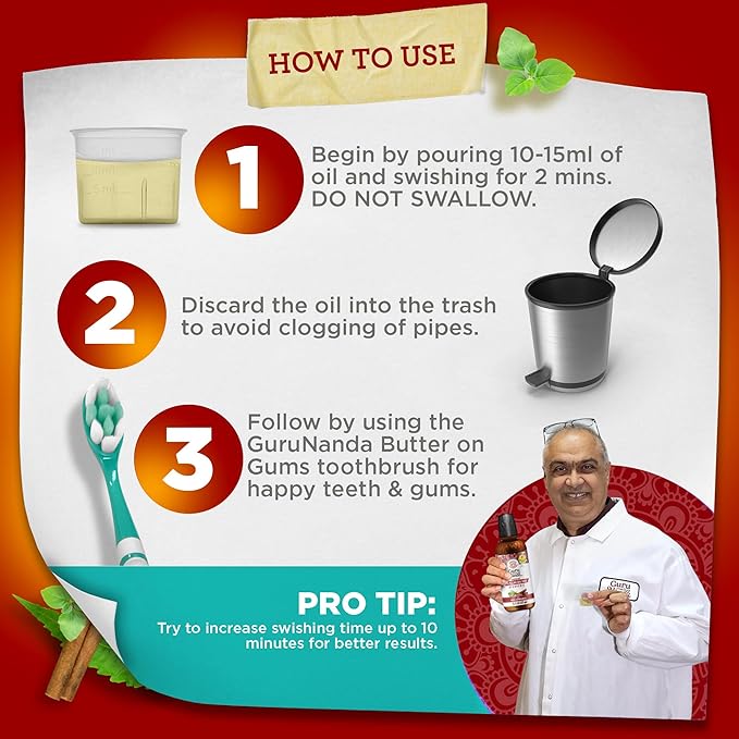 - HOW TO USE & WHO CAN USE: Pour 10-15ml of oil pulling, swish for 2 minutes, & gradually increase to 10 minutes. Discard the oil into trash to avoid clogging pipes. Swishing on an empty stomach is recommended for best use. Remember to follow by brushing your teeth using the GuruNanda Butter on Gums Toothbrush.