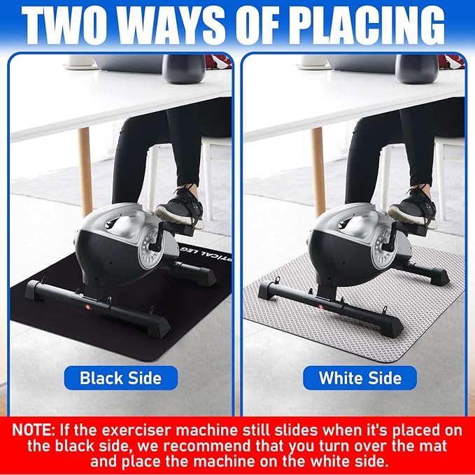 - 【Easy to Clean & Maintain】-- Made from an easy-to-clean material, the non-slip mat for under exercise equipment stays fresh and hygienic with a simple wipe, ensuring a clean workout space every time you step on your seated pedal gym.