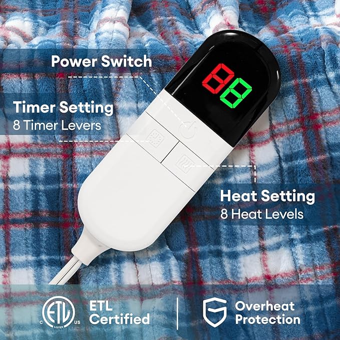 - Easy Operation & Smartly Designed: The heated throw have a fixed layer to prevent the heating wires from shifting, heat quickly and evenly,let you rest easily. Validated by ETL & FCC, our heated blankets come with 1-8hrs auto-off timer and 8 heating levels Catering for different temperature and OFF time requirements. Additionally once the temperature of the main body of the heated throw blanket is too high, the overheating protection will automatically trigger to turn off the heating automatically to protect the safety of you and your family. Safer and more energy-saving with auto-off timing (1-8H) leave you peace of mind