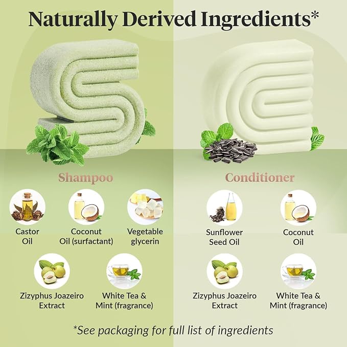 - BALANCED HYDRATION + CLARIFICATION IN ONE ROUTINE: Using the tea tree shampoo bar alongside the mint conditioner bar creates a complete routine—cleansing without stripping and hydrating without weighing hair down. This duo leaves your hair feeling bouncier, cleaner, and more manageable, from roots to ends.