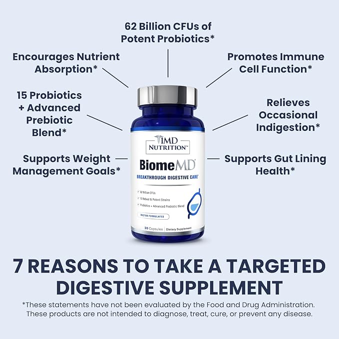 - Microbiome Balance: BiomeMD restores the right probiotic bacteria to your gut’s microbiome while nourishing them with powerful prebiotics they need to thrive.* This helps restore and maintain a strong balance of “good” bacteria in the gut for digestive and immune health.*