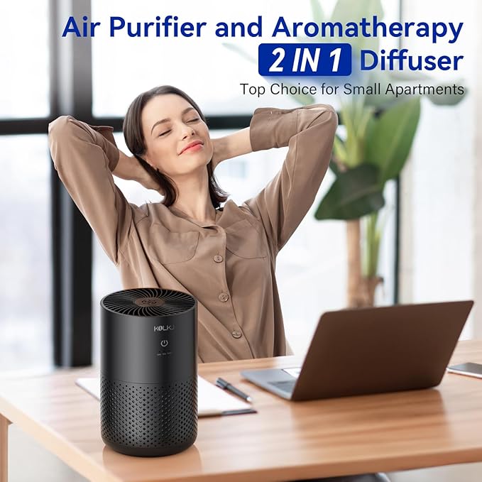 - 【Aromatherapy-Purification 2-in-1】Mini Air purifier built-in aromatherapy compartment,it allows you add a few drops of fragrant essential oils (not included) to the aroma pad to release a subtle, elegant fragrance while purifying the air—perfect for promoting relaxation or boosting alertness in studying、 working ect .Air purifier for pets help to get rid of pet odors.