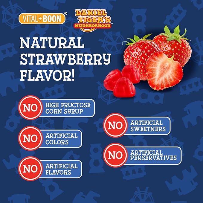 - PREMIUM SUPPLEMENTS FOR KIDS - Daniel Tiger's Neighborhood, the renowned children's show from Mister Rogers Productions on PBS kids is teaming up with Vital+Boon to create premium gummy supplements for kids. Help add tasty, kid-friendly dietary supplements to their daily routine.