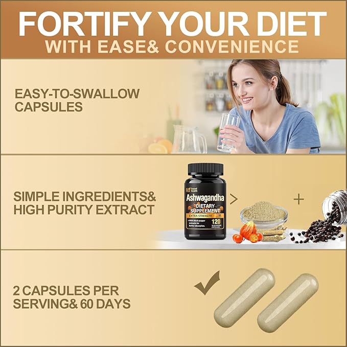 - CONVENIENT AND RELIABLE: Each bottle contains 120 capsules for easy portability and consumption, allowing you to enjoy the benefits of ashwagandha anytime, anywhere—at home, the office, or on-the-go. Our team is dedicated to delivering exceptional customer service for a shopping experience.