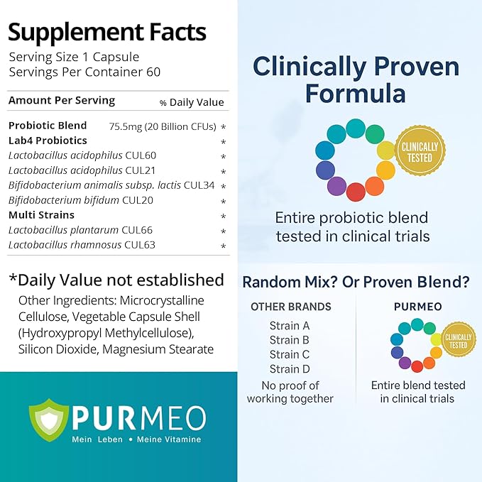 - ENTIRE FORMULA CLINICALLY TESTED: While many products mix various strains without proof of synergy, Purmeo's entire strain combination is backed by clinical trials - tested together, proven together. Designed to help avoid strain conflict found in mixed formulations. Each strain carries a unique ID - no generic or unverified ones. Supports a balanced, diverse, and thriving gut microbiome. Immune & digestive health you can trust