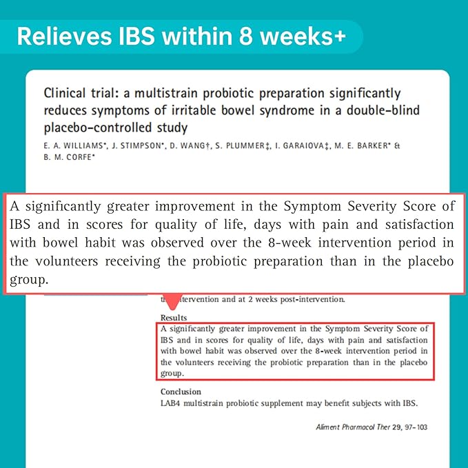 - BACKED BY SCIENCE: Supported by over 20 years of scientific research, Lab4 probiotics target the root causes of diarrhea, constipation, gas, bloating, and abdominal discomfort. In as little as 8 weeks, they help improve stool consistency, reduce bathroom visits, promote a balanced gut microbiome, and restore long-term digestive health - with research published in the U.S. National Library of Medicine