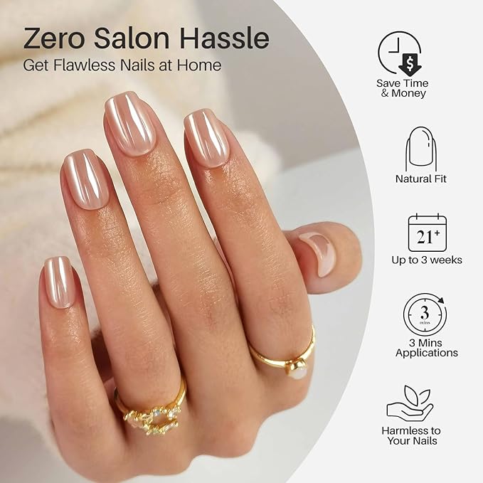Nude Chrome Press on Nails Square - Soft Gel Short Press on Nails for Women Gift, Fit Perfectly & Natural Glue on Nails in16 Sizes - 32 Reusable Fake Nails with Glue, Aurora Nude