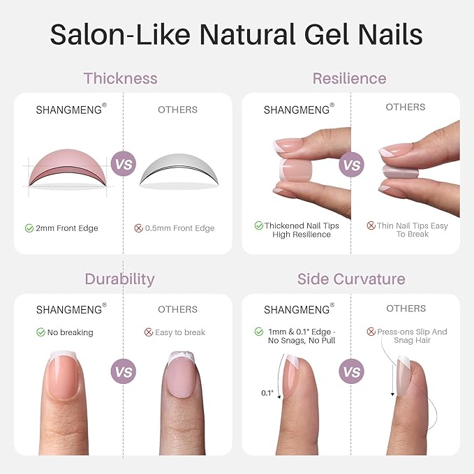 - ๐๐๐ญ๐ฎ๐ซ๐๐ฅ ๐๐๐ข๐ฅ ๐ ๐๐๐ฅ: SHANGMENG innovates with flexible, ultra-soft gel material to create press on nails that feel like real nails. Zero pressure to nail beds, gentle curvature, seamless cuticle blending โ effortlessly achieve stunning manicures