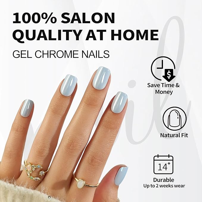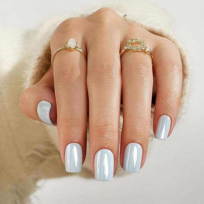Chrome Press on Nails Square - Soft Gel Blue Press on Nails Short for Women Gift, Glossy & Natural Stick on Nails with Glue in 16 Sizes - 32 Reusable Fake Nails, Aurora Light Blue