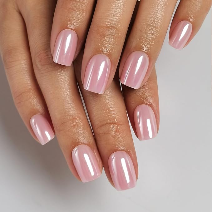 Pink Chrome Press on Nails Square - Soft Gel Press on Nails Short for Women Gift, Glossy Stick on Nails with Glue in 16 Sizes - 32 Reusable Fake Nails, Aurora Light Pink