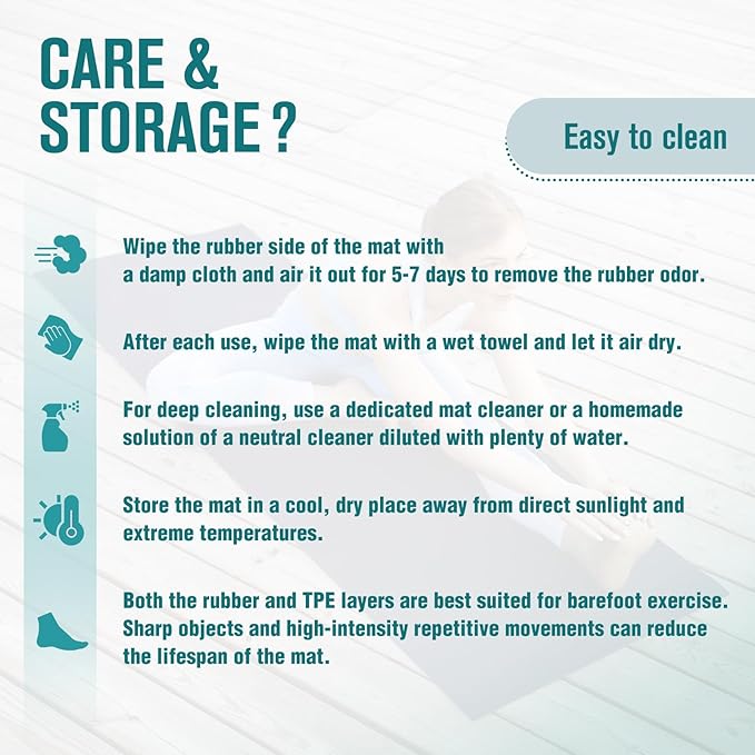 - CARE INSTRUCTION - 1. All natural rubber possesses a harmless rubber aroma. Wipe the rubber side with a damp cloth and place it in a well-ventilated area for 5-7 days, allowing the scent to gradually fade. 2. Store the yoga mat in a cool, dry place away from direct sunlight and extreme temperatures.