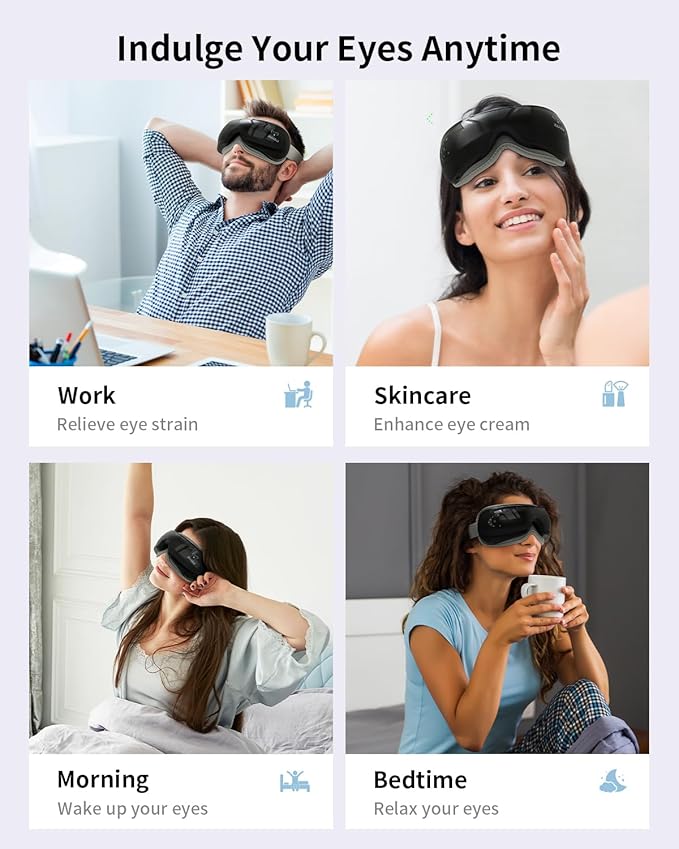 - Customization and Memory Function: Enjoy 5 massage modes and adjust heat (high/low/off) and music volume (high/medium/low/off) with a simple press for targeted relaxation. The unique memory function automatically resumes the last used massage mode upon startup, ensuring effortless relief from eye fatigue every time.Charging takes approximately 2-3 hours, and the massager has a 15-minute auto-off feature for heat therapy. Note: When in use while charging, its protective mechanism will shut off automatically.