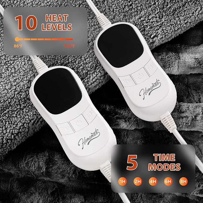 - Eesy to Use: Homemate heated blanket have 10 heat levels, 1h 2h 4h 6h 8h auto shut off. Temperature range is 86-122°F. There is only one button on the controller to control the temperature, very convenient to use, even the elderly, the sick, and the disabled can use it easily. Power cord is 16.7ft, this long cord makes the use of the warm blanket more flexible, can be used on the bed, on the sofa, can be used in the study and office, very convenient