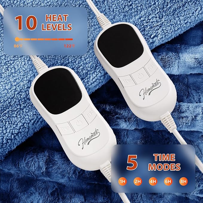 - Eesy to Use: Homemate heated blanket have 10 heat levels, 1h 2h 4h 6h 8h auto shut off. Temperature range is 86-122°F. There is only one button on the controller to control the temperature, very convenient to use, even the elderly, the sick, and the disabled can use it easily. Power cord is 16.7ft, this long cord makes the use of the warm blanket more flexible, can be used on the bed, on the sofa, can be used in the study and office, very convenient