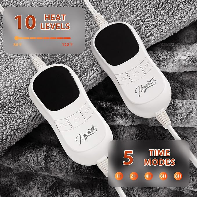 - Eesy to Use: Homemate heated blanket have 10 heat levels, 1h 2h 4h 6h 8h auto shut off. Temperature range is 86-122°F. There is only one button on the controller to control the temperature, very convenient to use, even the elderly, the sick, and the disabled can use it easily. Power cord is 16.7ft, this long cord makes the use of the warm blanket more flexible, can be used on the bed, on the sofa, can be used in the study and office, very convenient