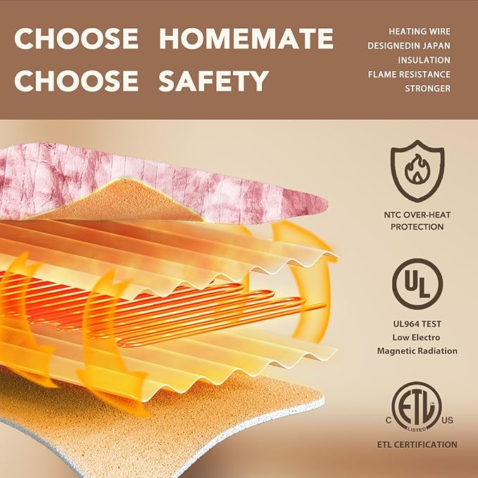 - Safety: Homemate heated blankets have passed the American safety UL964 Test. Have ETL Certification.Lower Electro Magnetic Radiation.The heating wire is designed and produced by Japanese company,more advanced technology,stronger insulation and flame resistance.Moreover,the heating blanket use NTC overheating protection technology to ensure that it will not overheat and cause burning. And our heating wire is longer, so the heating area is larger and the heat is more evenly distributed