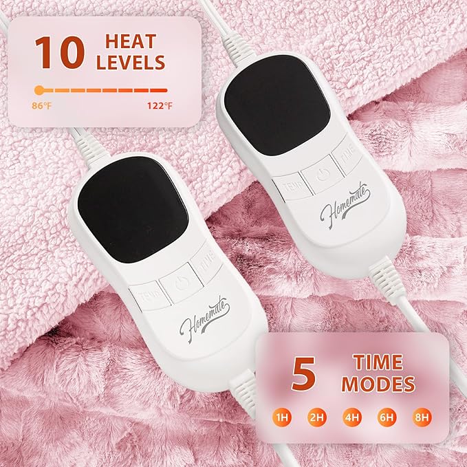 - Eesy to Use: Homemate heated blanket have 10 heat levels, 1h 2h 4h 6h 8h auto shut off. Temperature range is 86-122°F. There is only one button on the controller to control the temperature, very convenient to use, even the elderly, the sick, and the disabled can use it easily. Power cord is 16.7ft, this long cord makes the use of the warm blanket more flexible, can be used on the bed, on the sofa, can be used in the study and office, very convenient
