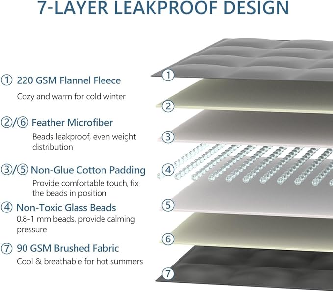 - Easily Care & Machine Washable: This 5 lb weighted blanket is easy to clean and maintain. It can be machine washed or tumble dried. We recommend washing in cold water and tumble drying or air drying on low. No bleaching or ironing is required.The 7-layer design and tight alignment stitching prevents beads from leaking, so you can use it with confidence. We provide a full range of considerate service, if you have any questions about our adult weighted blanket, you can ask us at any time