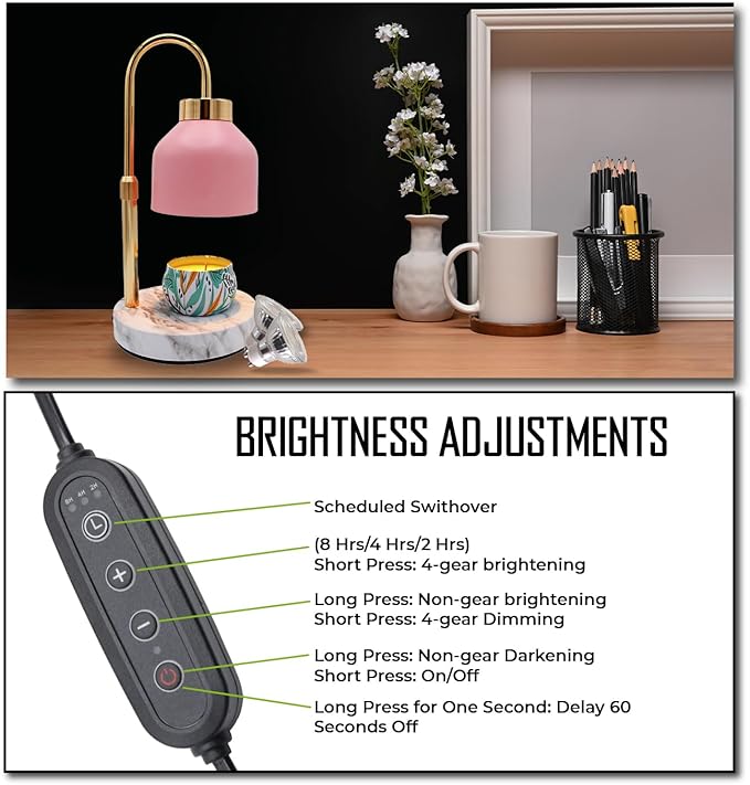- This lamp candle warmer offers 4 levels of adjustable brightness (0%-25%-50%-75%-100%) to control the melting speed of your candles. With a color temperature of 0-2800k and a timer feature of 2H/4H/8H