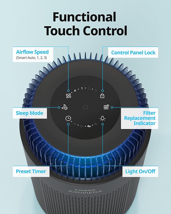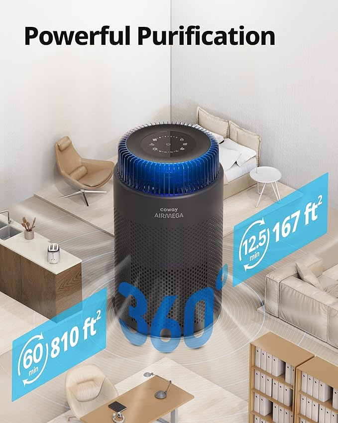 COWAY Air Purifiers for Bedroom Home up to 810 ft², True HEPA Filter for Smoke, Allergies, Pet Dander, Odor, AQI Monitor, Auto&Sleep Mode, Timer, Filter Indicator, Night Light, 3yr Warranty, 100 Black