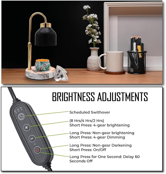 - This lamp candle warmer offers 4 levels of adjustable brightness (0%-25%-50%-75%-100%) to control the melting speed of your candles. With a color temperature of 0-2800k and a timer feature of 2H/4H/8H