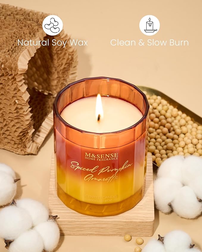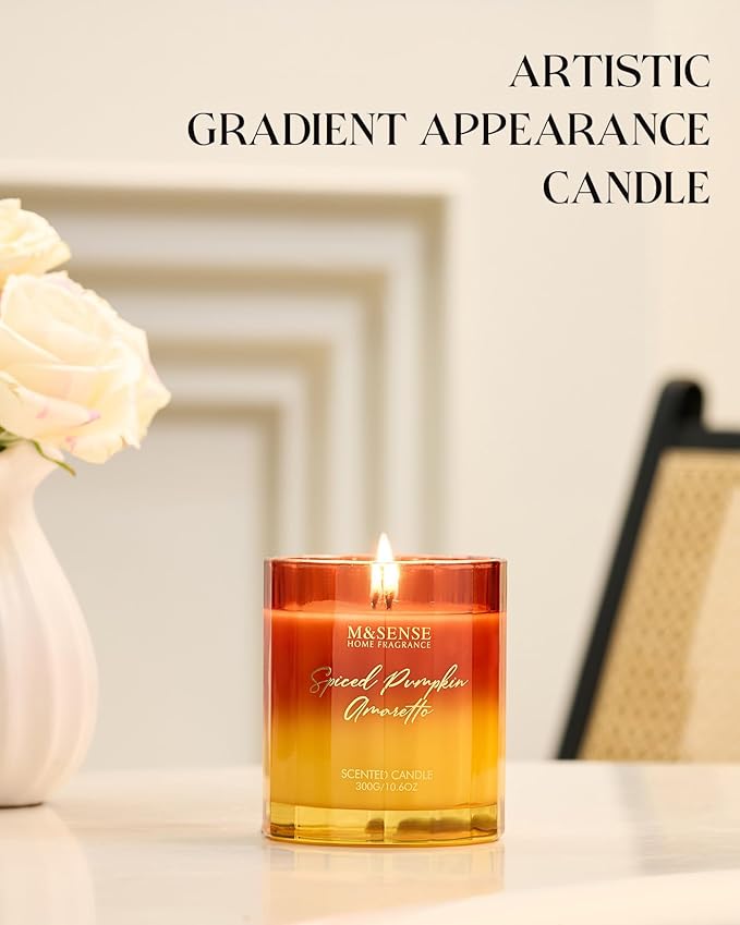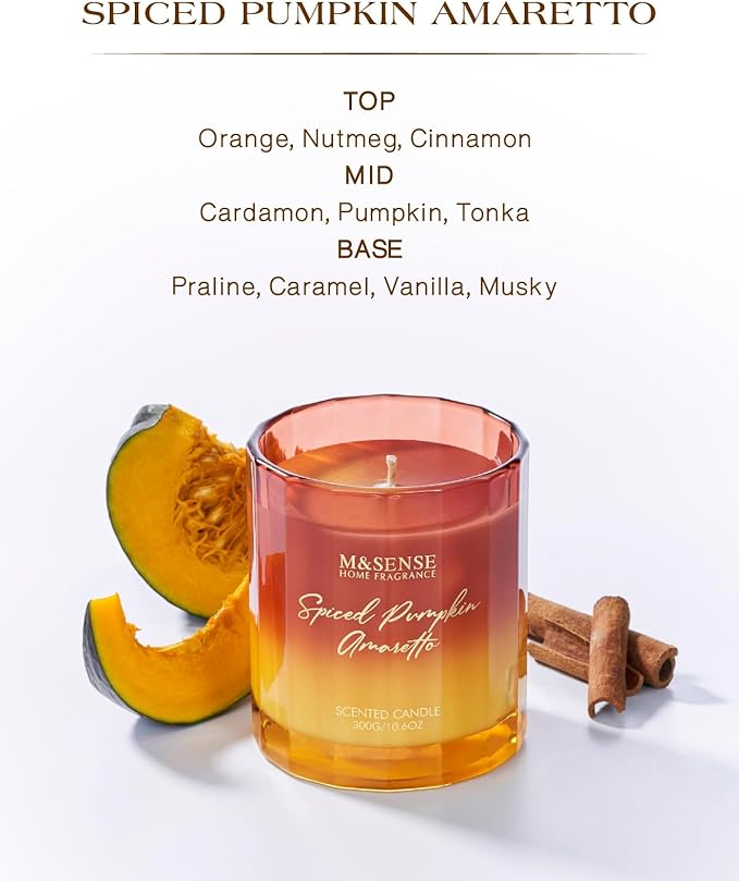 - Spiced Pumpkin Amaretto - As orange, nutmeg, pumpkin and caramel mingle, a captivating and unique scent emerges. When you light the candle, the aroma fills up the whole room and brings a sense of romance and warmth, rich and harmonious, intoxicating. This candle collection comes in multiple scents, you can choose according to your preference and space.