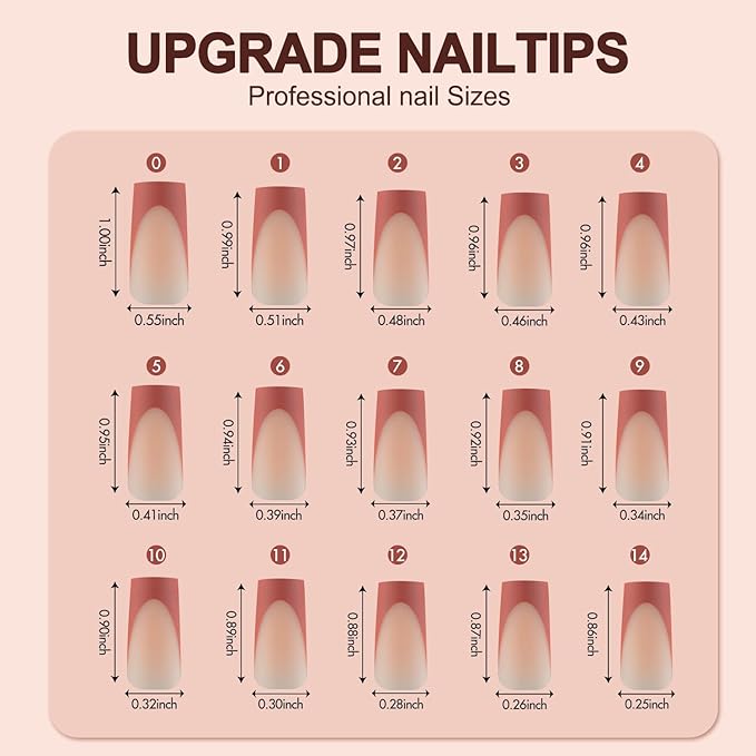 - 【UPGRADE NAIL TIPS】These square nails come in 15 different sizes, with 10 nails for each size, totaling 150 nails. With a professional nail size database, it's easier to find the right nail size for you. You can easily extend your French fake nails and enjoy the fun of DIY nail enhancement!