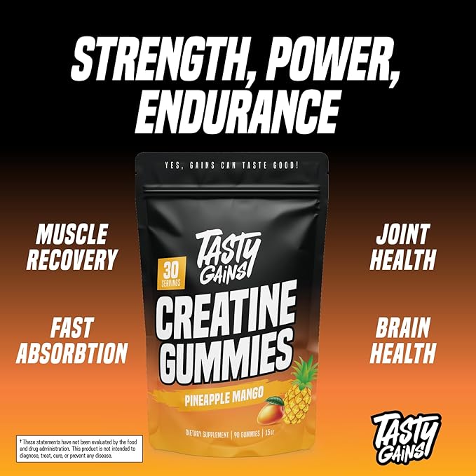 - MUSCLE GROWTH - Creatine Monohydrate is proven to increase muscle mass, leading to a more defined look. Just take Tasty Gains creatine gummies & watch your muscles grow as you continue to workout.