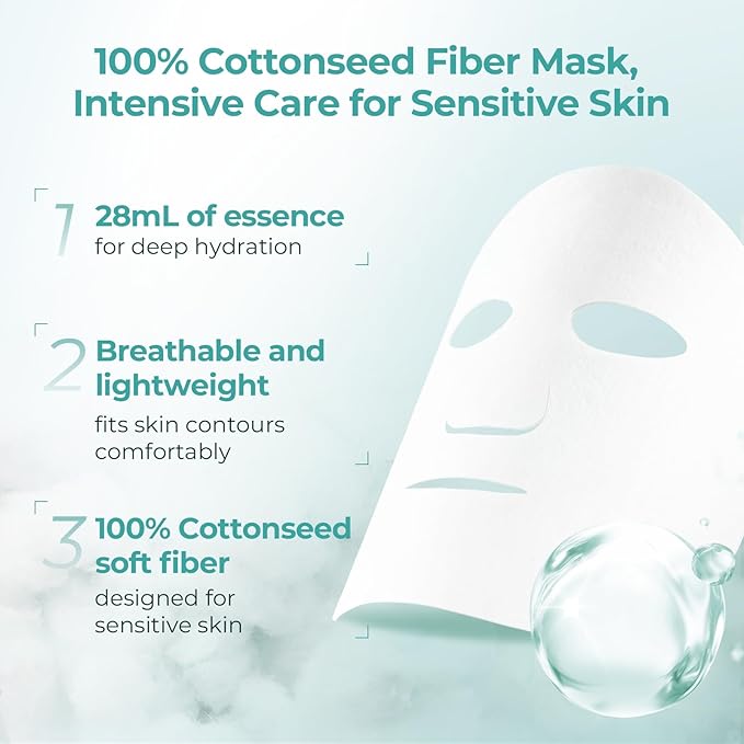 - 100% Cottonseed Fiber Mask, Intensive Moisture for Sensitive Skin: Soft and lightweight, fits skin contours without burden. Infused with 28mL of essence for long-lasting hydration and deep moisture. Made from eco-friendly materials that naturally decompose, reducing environmental impact.
