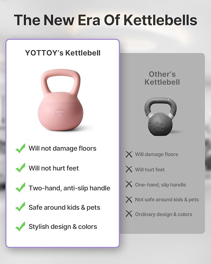 - Shock-Absorbing Soft Kettlebell Base: Our YOTTOY soft kettlebell features a sand-filled base to reduce impact, protecting your floors while minimizing noise. This makes it an ideal choice for strength training kettlebells, ensuring a safe and comfortable workout experience