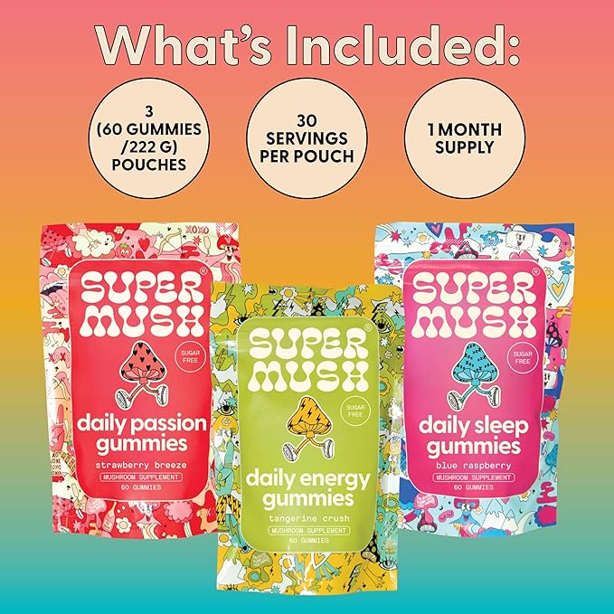 Daily Gummies (Trio Bundle) - Daily Passion, Energy, & Sleep - Mushroom Gummies - Natural, Organic, Vegan, & Sugar-Free Mushroom Supplement - Ashwagandha Supplements with Cordyceps