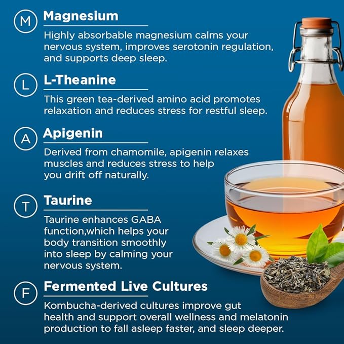 - Natural Sleep Supplement - Relax your mind and body. Our gummies combine magnesium, L-theanine, apigenin, taurine, vitamin B6, and kombucha to help ease you into a restful night's sleep.