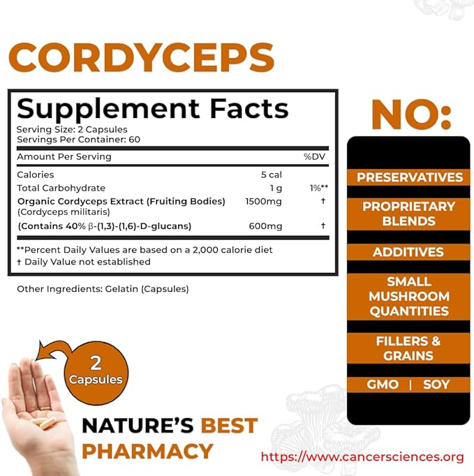 Cancer Sciences Cordyceps Mushroom Supplement Capsules - 1,500mg Organic Mushroom Complex for Wellness, High Potency 40% Beta-Glucans, Immune Support Supplement for Energy & Stamina Booster, 120 Count
