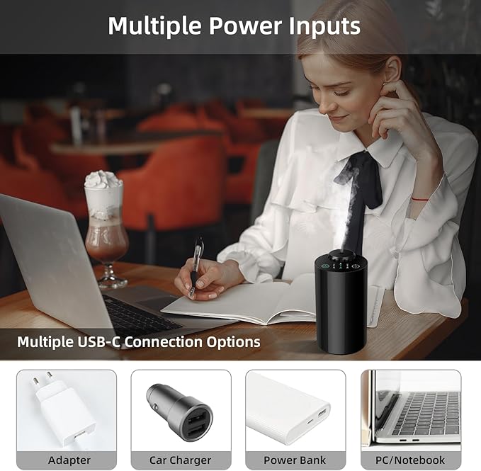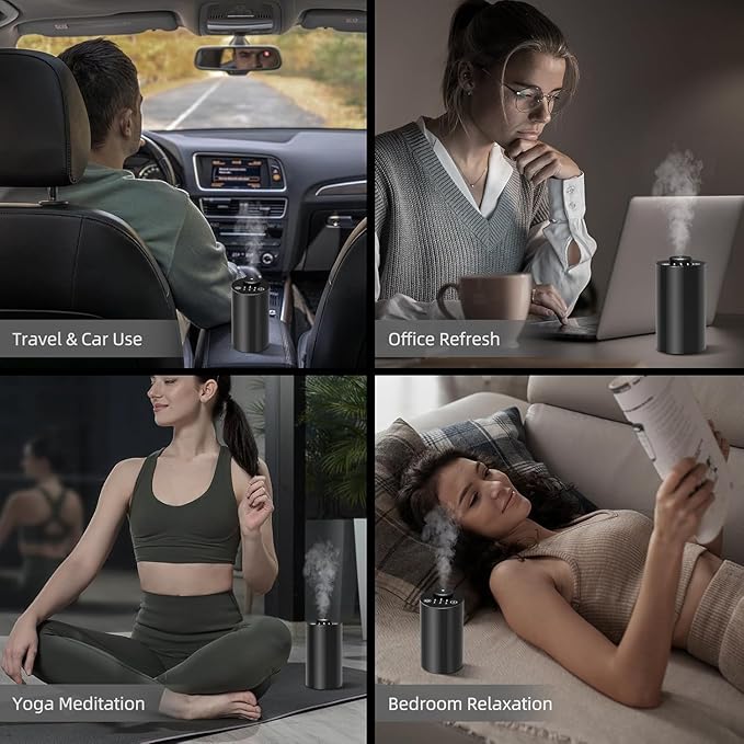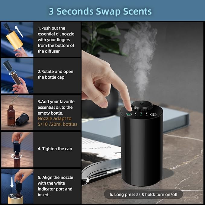 Waterless Essential Oil Diffuser Aromatherapy Scent Diffuser for Home Large Room, Bedroom, Car, Office, Desk, Battery Operated Mini Portable Air Freshener,4 Timers & 3 Mist Levels (Black)