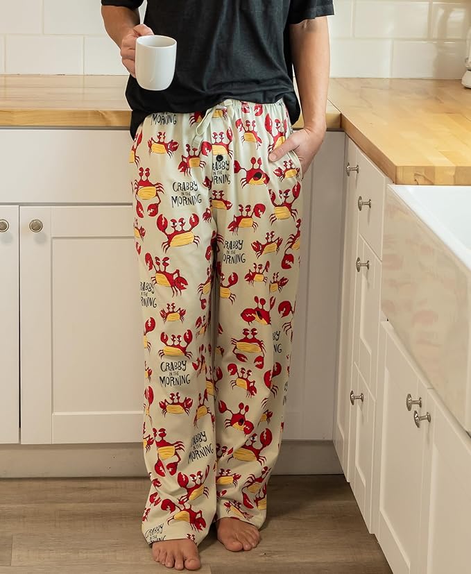- FUNNY DESIGNS: This pair of pajama pants features a humorous crab design. These novelty pants are sure to make you laugh with their clever jokes.