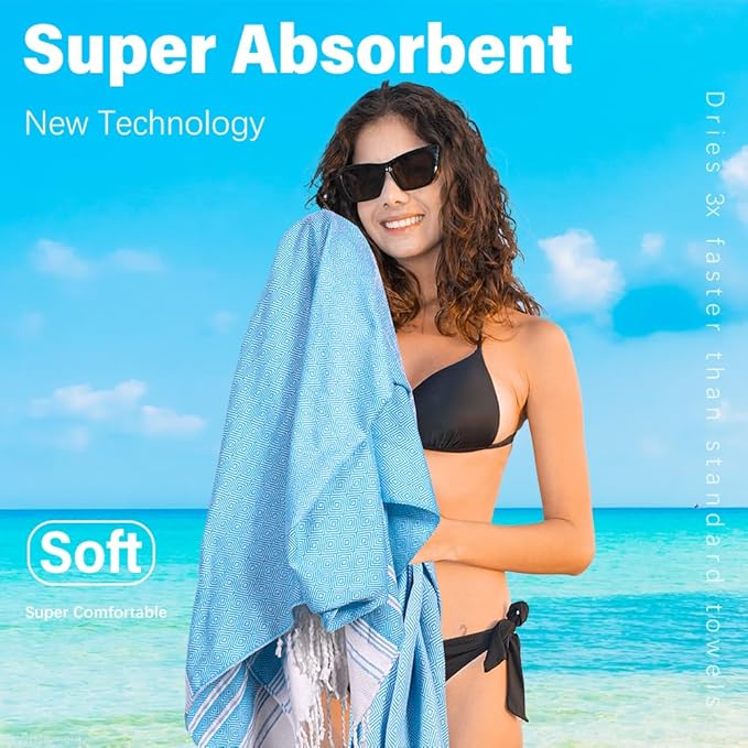 - LIGHTWEIGHT AND SAND FREE:The turkish beach towels make your holiday relaxing and enjoyable.This beach towel is light and breathable.And it is compact and easy to fold,which is very space saving.Pack it in a bag and go anytime.Besides,when you're done playing at the beach,just give it a shake,leave the sands where they belong to