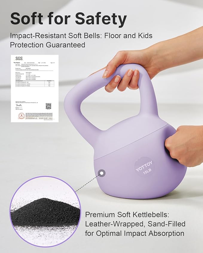 - Shock-Absorbing Soft Kettlebell Base: Our YOTTOY soft kettlebell features a sand-filled base to reduce impact, protecting your floors while minimizing noise. This makes it an ideal choice for strength training kettlebells, ensuring a safe and comfortable workout experience