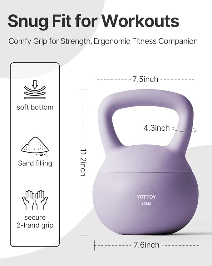 - Shock-Absorbing Soft Kettlebell Base: Our YOTTOY soft kettlebell features a sand-filled base to reduce impact, protecting your floors while minimizing noise. This makes it an ideal choice for strength training kettlebells, ensuring a safe and comfortable workout experience