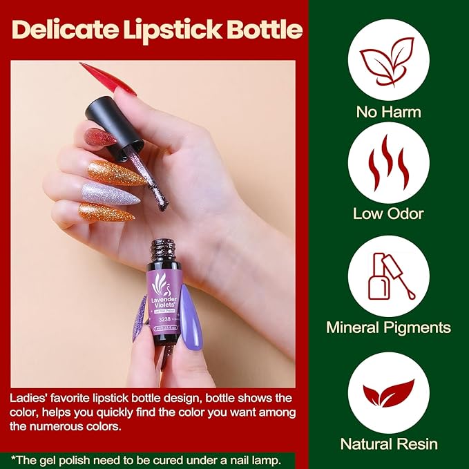 - One Set for All Nail Art: LAVENDER VIOLETS gel polish kit perfect for any season. You’ll find shades like black, white, red, pink, green, blue, and glitter. Made from non-toxic ingredients, our gel nail polish is safe and low in odor, allowing you to enjoy beautiful nails without worry. This versatile nail art kit complements any outfit, making it ideal for the office or a seaside getaway. With proper application, enjoy gorgeous nail art for 3–4 weeks.
