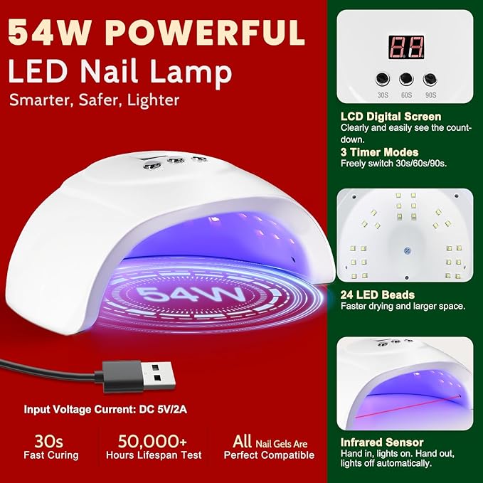 - Upgraded U V Nail Lamp: The gel nail kit with U V light includes a powerful 54W nail dryer that cures all U V and LED gel polishes quickly and evenly. The innovative infrared sensor activates the lamp automatically when you insert your hand, simplifying the curing process. With convenient settings of 30s, 60s, and 90s, you can easily touch up or thoroughly cure your nails. If you feel any discomfort, simply remove your hand and resume when comfortable, ensuring a pleasant experience with our gel nails kit with U V light.
