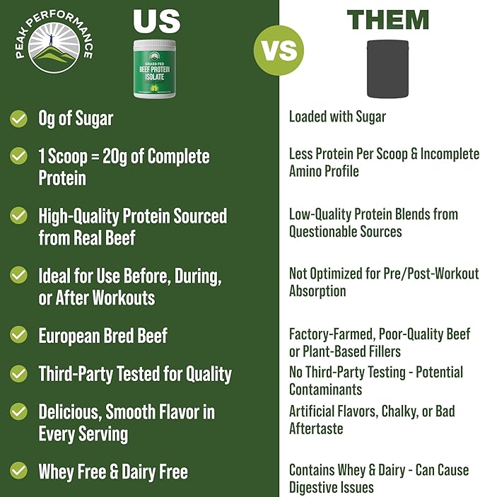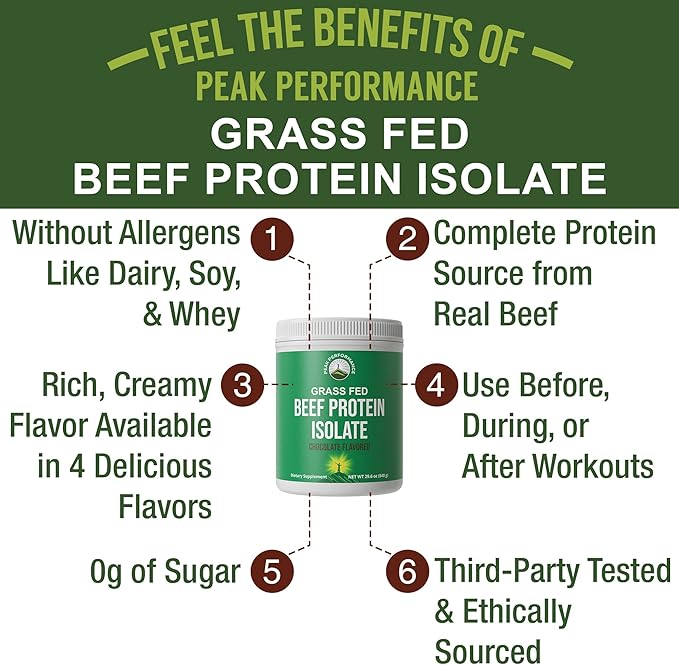 - 1 Scoop = 20 grams of Complete Protein with 0g of Sugar! - Peak Performance Grass Fed Beef Protein Isolate is a superior alternative to protein sources containing common allergens such as dairy, soy, and whey. This product provides a complete source of protein, offering essential nutrients derived from real beef.