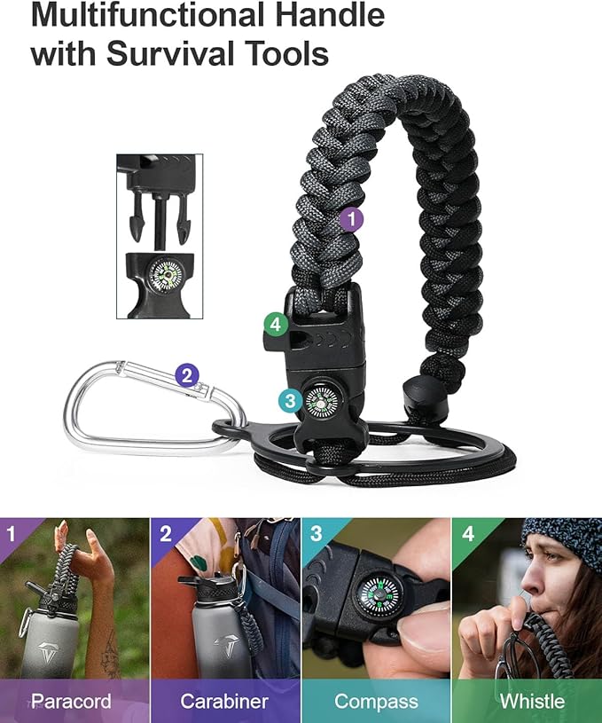- Ready for adventures: Topre 32oz water bottles include a paracord handle,it is crafted from sturdy braided rope with an attached survival kit. This includes a compass, a whistle, and a clip, making it an ideal companion for any outdoor activity — be it camping,hiking or exploring new places through travelling.