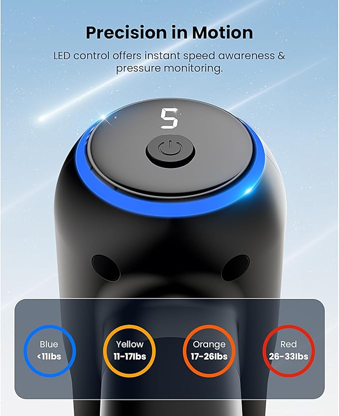 - LED Stall Force Display with Customizable Speed Range & Force Meter light - C2 Max gives you complete control over your recovery routine by conveniently displaying your current speed and a responsive force meter. And whether you’re treating sensitive areas or need the full power of the device. It also comes with 5 built-in speeds (2000, 2300, 2600, 2900, 3200 percussions per minute)