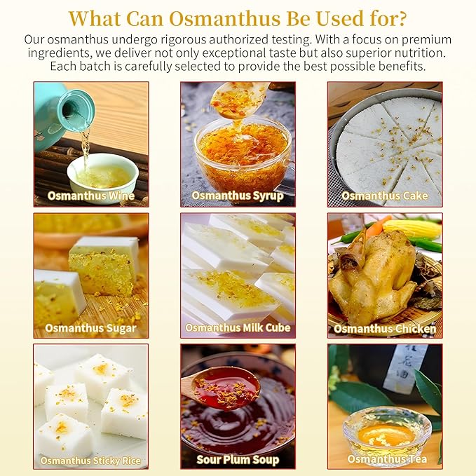 - Nutritious and Delicious: Osmanthus has versatile culinary uses. It can be brewed into fragrant tea, added to traditional desserts like osmanthus cake, rice dumplings, and mooncakes, or used in beverages like osmanthus wine and honey. It also enhances porridge, soups, and dishes, adding a naturally sweet and floral aroma to your meals.