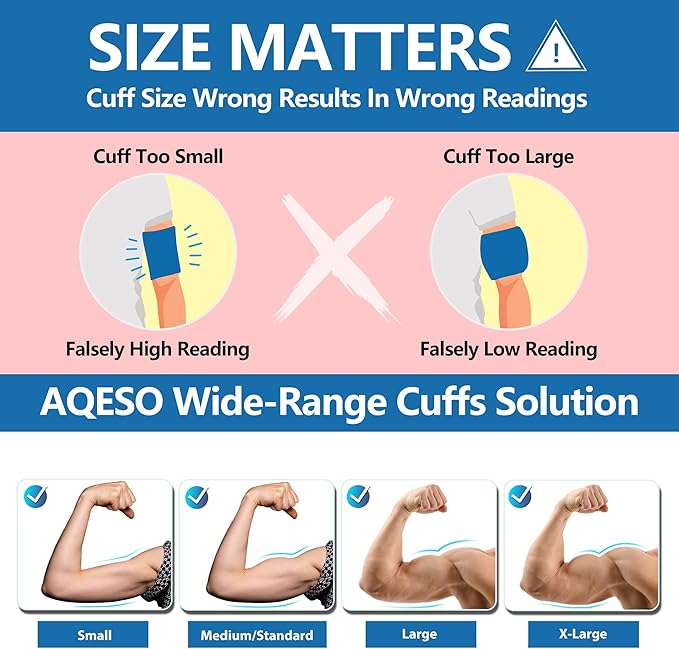 - Tips for Accurate Blood Pressure Readings - Consider three key factors: proper body position for measuring, BP machine with proven accuracy, and well-fitted cuff. AQESO BP machine with ASP signal processing tech, 100,000+ clinical data tested, can deliver readings accurate and fast. To achieve greater accuracy, AQESO wide-range cuff solution offers cuffs for arms ranging from 7" to 21" in Small, Medium/Large & XL sizes, ensuring comfortable fit for all.