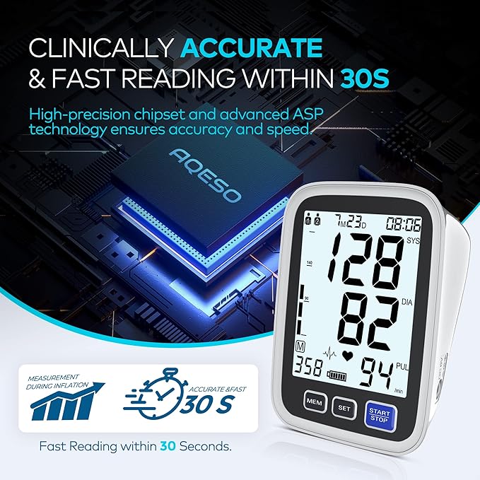 - Easy to Read & Easy to Use - AQESO blood pressure machine is designed for easy use and read. The large 4-inch backlit LCD display with oversized numbers, ideal for seniors. With one-touch operation, it automatically measures diastolic, systolic. Additionally, it has an integrated D-ring and Hook and Loop Fastener, which makes it easy to put on and take off.