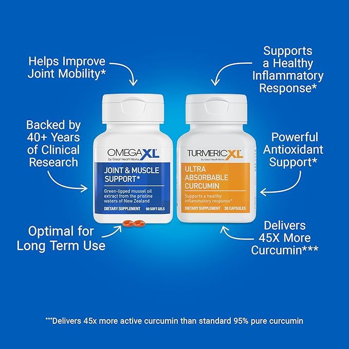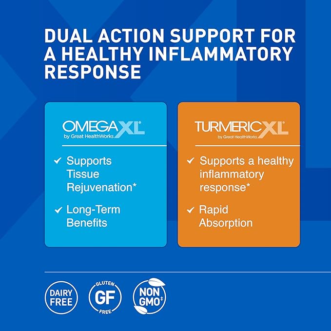 - ONE, TWO PUNCH – These two powerful products complement each other as they both work to promote a healthy inflammatory response, but in different ways. OmegaXL targets the resolution phase of inflammation where tissue rejuvenation occurs, whereas TurmericXL targets the initiation phase of inflammation. OmegaXL can take time to build in your system, while TurmericXL is rapidly absorbed and distributed throughout the body because of its advanced delivery system. That's why we created this combination, so TurmericXL can start to get to work while OmegaXL reaches its full potential.