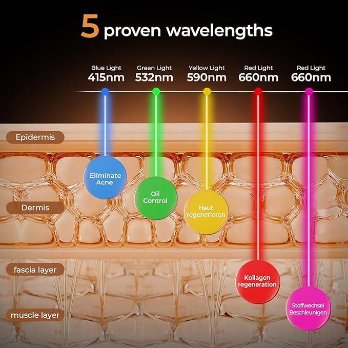 - 4 in 1 LED Red Light Therapy: Our red light therapy mask adopted 5 wavelengths (415nm, 532nm, 590nm, 660nm, 850nm) and 4 treatment modes (Anti-aging, Restoring, Brightening, Remove-acne) to provide a more comprehensive and efficient skin care experience to meet different skin needs. Say goodbye to single wavelength/mode red light mask devices.