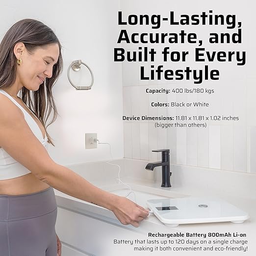 - Long-Lasting Rechargeable Battery: With a powerful 800mAh Li-ion battery, this smart scale ensures long-lasting performance for uninterrupted tracking. It eliminates frequent recharges & is ideal for daily use or during health-focused seasons like New Year or summer. Use it with smartphones and apps to effortlessly monitor progress, making it a must-have tool for fitness enthusiasts and health-conscious users.