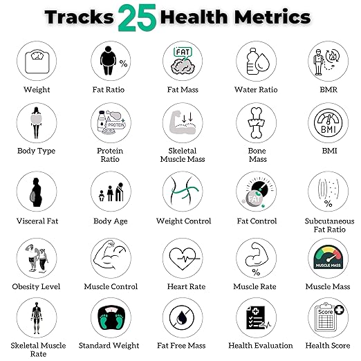- Smart Body Composition Scale: FSA and HSA elegible, Monitor your health with precision using this advanced smart scale, designed for daily use at home, gyms, or clinics. Track 25 essential fitness metrics like Body Weight, BMI, Muscle Mass, and more, including advanced insights such as Metabolic Age and Visceral Fat. Perfect for athletes, dieters, or health-conscious individuals, this scale syncs with smartphones and health apps, delivering real-time data for informed wellness decisions.